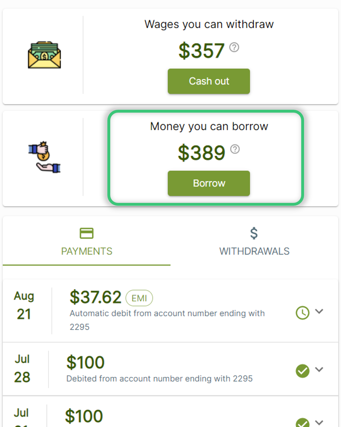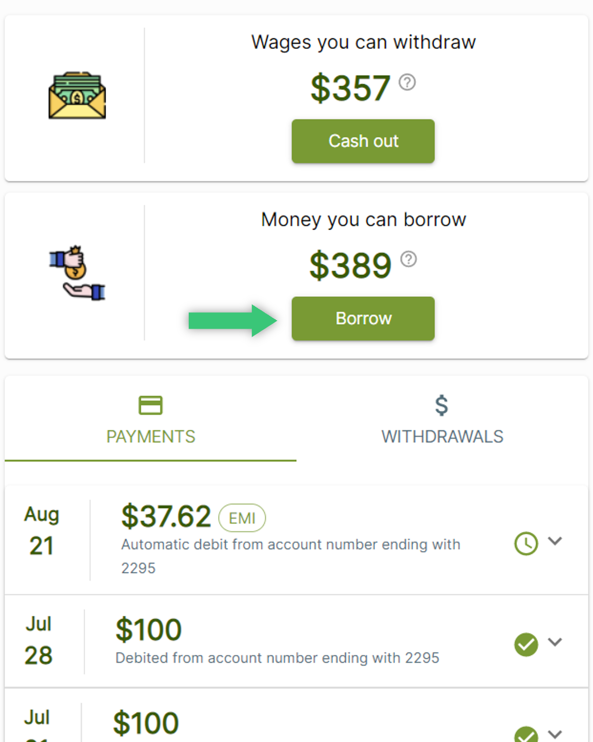 The "Borrow" button will take you to the screen where you can borrow any amount up to the limit for which you're eligible, as show in Step 1.
