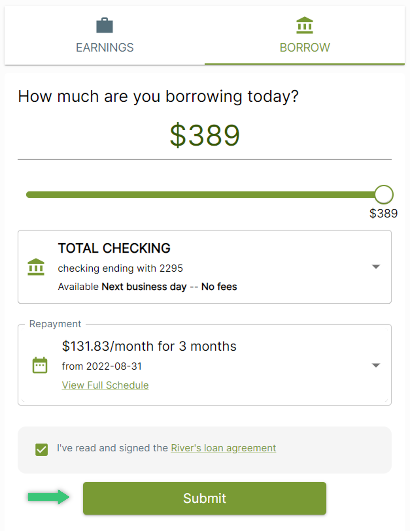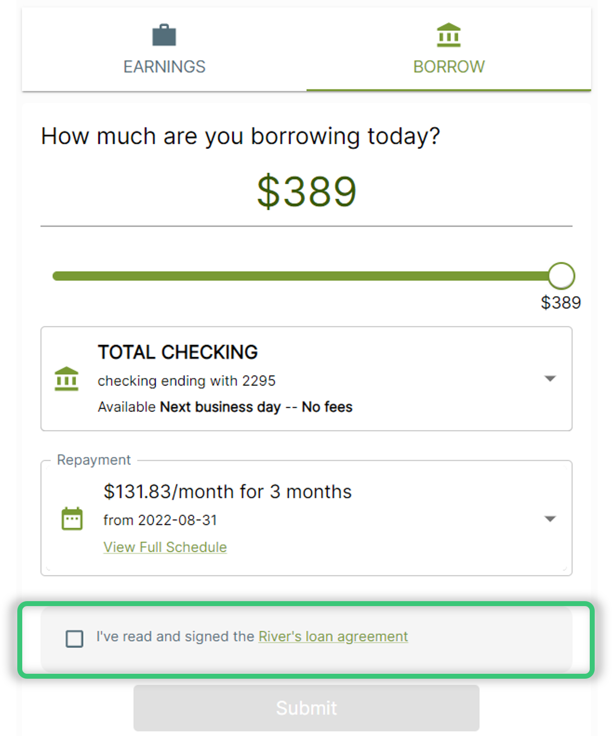 That's it! Once you press "Borrow", River will send that amount to your destination bank account. You may change the destination bank account in the drop down on the screen if you choose.